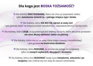 💜 Przejdziesz proces zmiany przekonań i tożsamości – nauczysz się świadomie kreować życie.